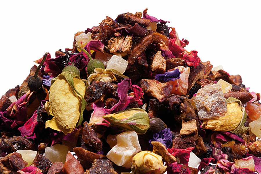 Ingrediënten: geroosterde stukjes peer (54,4%), ananasstukjes (ananas, suiker, citroenzuur), papaya (papaya, suiker), mango (mango, suiker, citroenzuur), aroma’s, dadelsblokjes, rozenblaadjes- en knopjes, bosbessen, zachte bloesem.