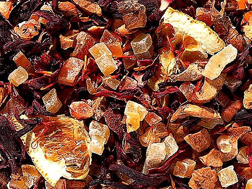 Papayastukjes (papaya, suiker), mangostukjes (mango, suiker, voedingszuur: citroenzuur), appelstukken, hibiscusbloesem, aroma, sinaasappelschijfjes, granaatappelpitten, saffloer.