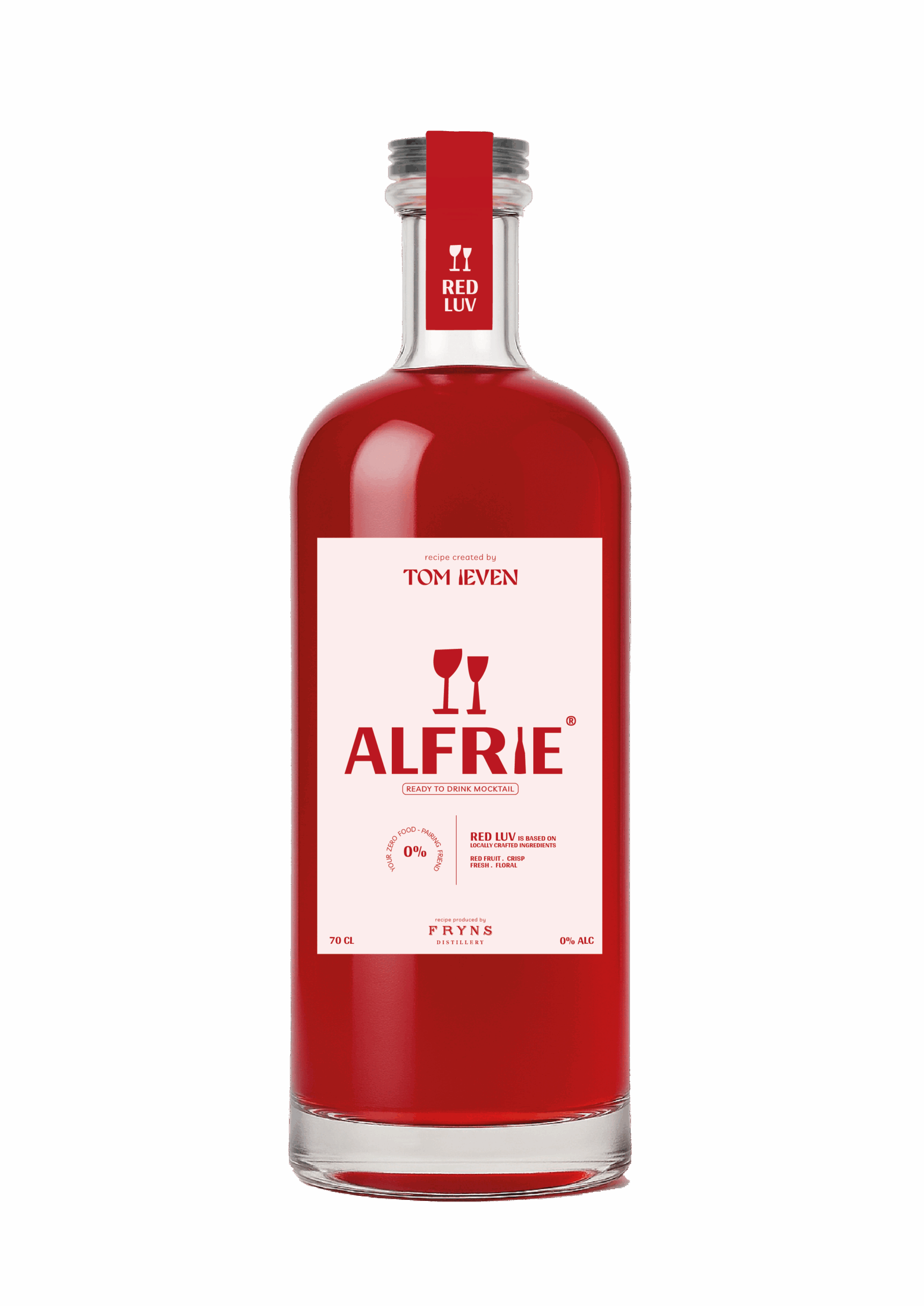 Ontdek ALFRIE – Red Luv, een elegante en alcoholvrije mocktail die smaak en verfijning samenbrengt. Deze unieke ready to drink mocktail is het resultaat van een samenwerking tussen topsommelier Tom Ieven en Fryns Distillery, waar vakmanschap en smaakbeleving centraal staan.